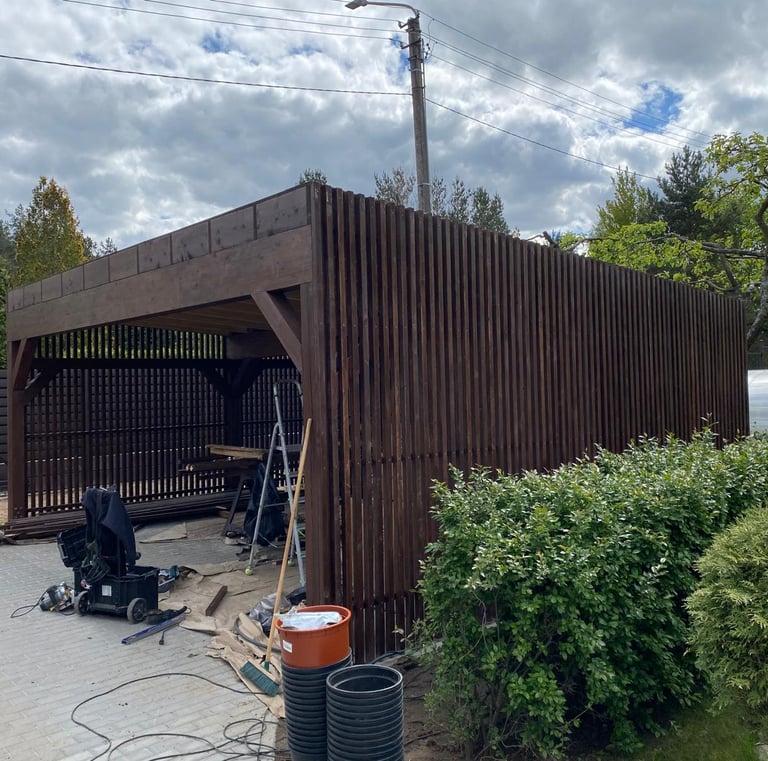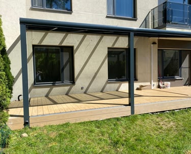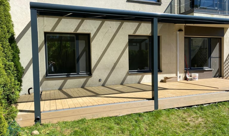 Profesionaliai sumontuotos medinės ir aliuminio stoginės apsaugo terasas nuo lietaus ir saulės.