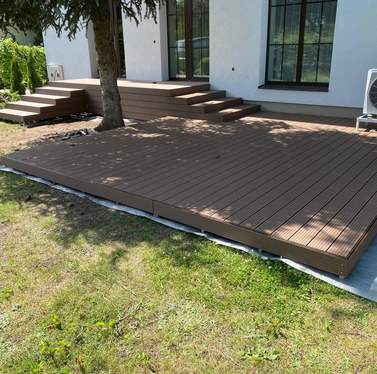 WPC terasos lentos suteikia patvarumą ir natūralų vaizdą, puikiai tinka jaukioms lauko erdvėms.